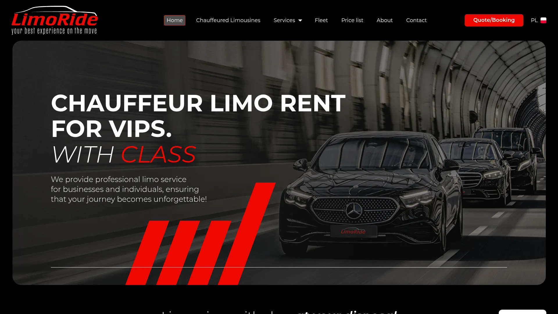 LimoRide to ekskluzywna firma transportowa specjalizująca się w wynajmie luksusowych limuzyn dla wymagających klientów biznesowych i prywatnych. Zlokalizowana w Piastowie przy ul. Mickiewicza 11, oferuje najwyższej klasy usługi transportowe, które łączą wygodę, bezpieczeństwo i dyskrecję. Misją firmy jest zapewnienie klientom niezapomnianych podróży, które spełniają najwyższe standardy komfortu, przy zachowaniu pełnego profesjonalizmu.